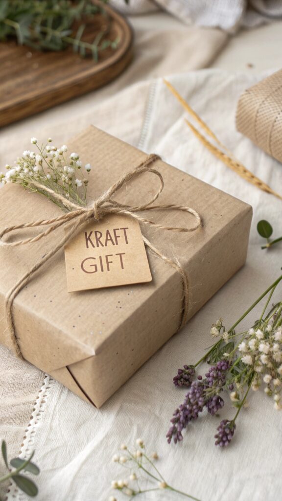 Description: Use plain kraft paper adorned with twine, dried flowers, or sprigs of greenery for a rustic look.