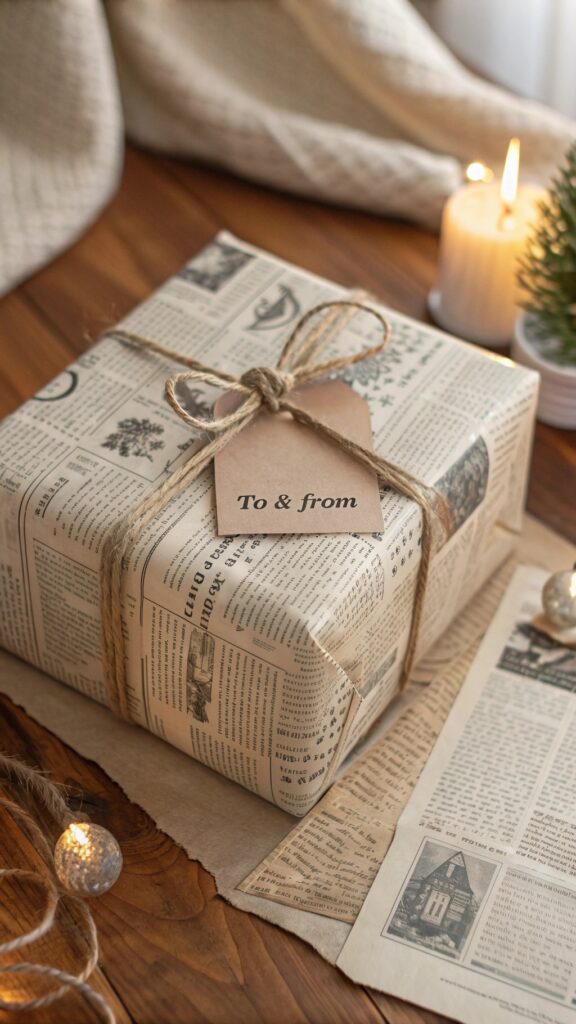 Description: Repurpose old newspapers for a vintage-inspired wrapping solution.