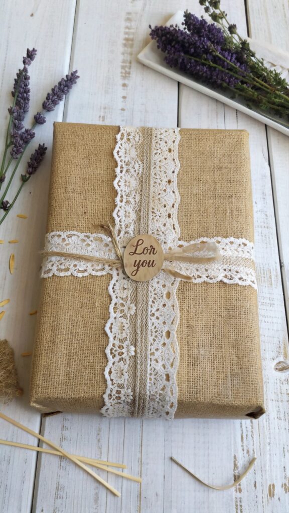 Description: Wrap gifts in burlap and accent with lace for a rustic-chic aesthetic.