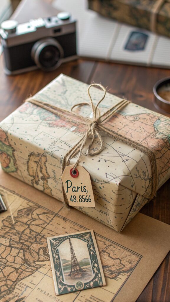 Description: Use old maps to wrap gifts, perfect for travel enthusiasts.