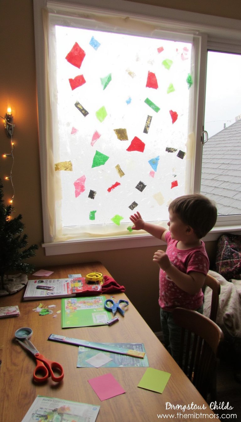 Tape a sheet of clear contact paper to the window, sticky-side out. Cut up small pieces of tissue paper, festive cellophane, or even colorful magazine clippings.