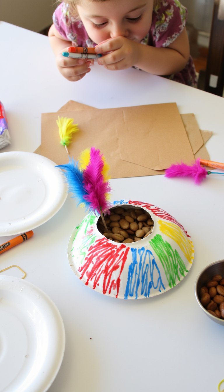 Staple or tape most of the way around, leaving a small gap. Let your toddler stuff in a few more colorful feathers or streamer pieces through the hole, then seal it completely. They now have a colorful, dual-sided maraca perfect for a rhythm band.