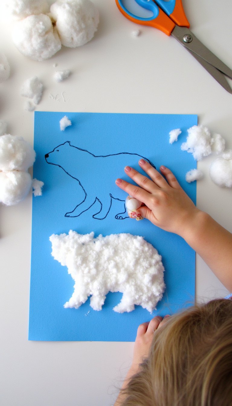 Soft, fluffy, and oh-so-tactile—this craft is pure sensory joy. Draw a simple polar bear silhouette on blue paper (to represent icy waters). Give your toddler a bowl of cotton balls and a glue stick. Let them pull the cotton balls apart to make them fluffier, then glue them inside the bear shape to create a wonderfully textured, snowy-white coat. It’s incredibly satisfying to touch and so easy for the tiniest of crafters.